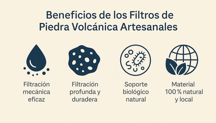 Nuestros filtros de piedra volcánica artesanal son una solución natural, económica y sostenible para mejorar la calidad del agua. Gracias a su estructura altamente porosa, funcionan como la primera gran barrera en los sistemas de filtración, con beneficios únicos: